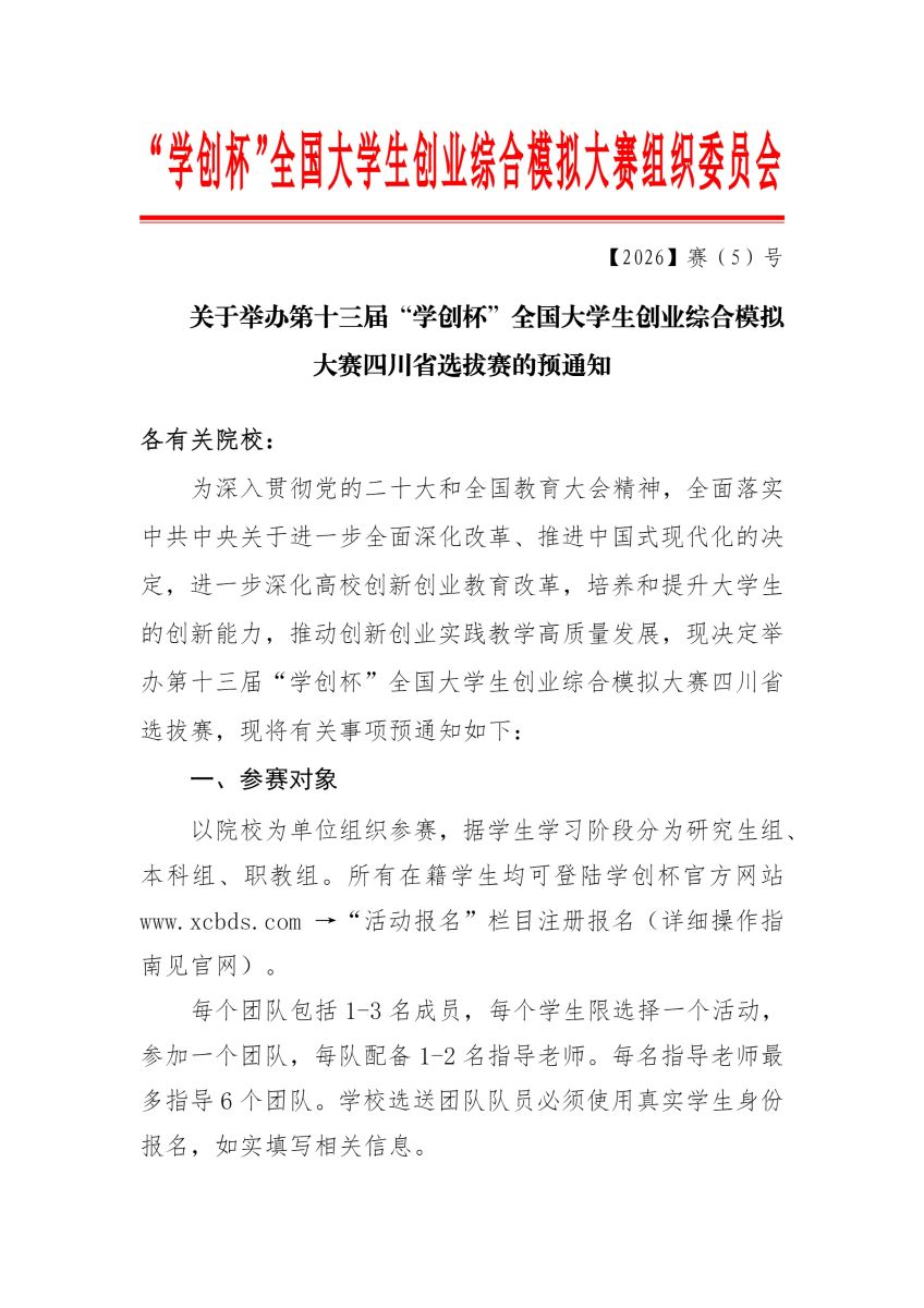 关于举办第十三届“学创杯”全国大学生创业综合模拟大赛四川省选拔赛的预通知