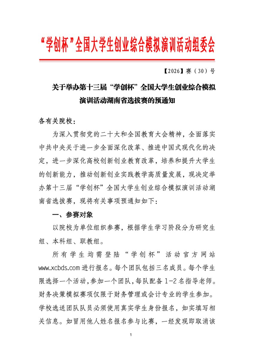 关于举办第十三届“学创杯”全国大学生创业综合模拟演训活动湖南省选拔赛的预通知