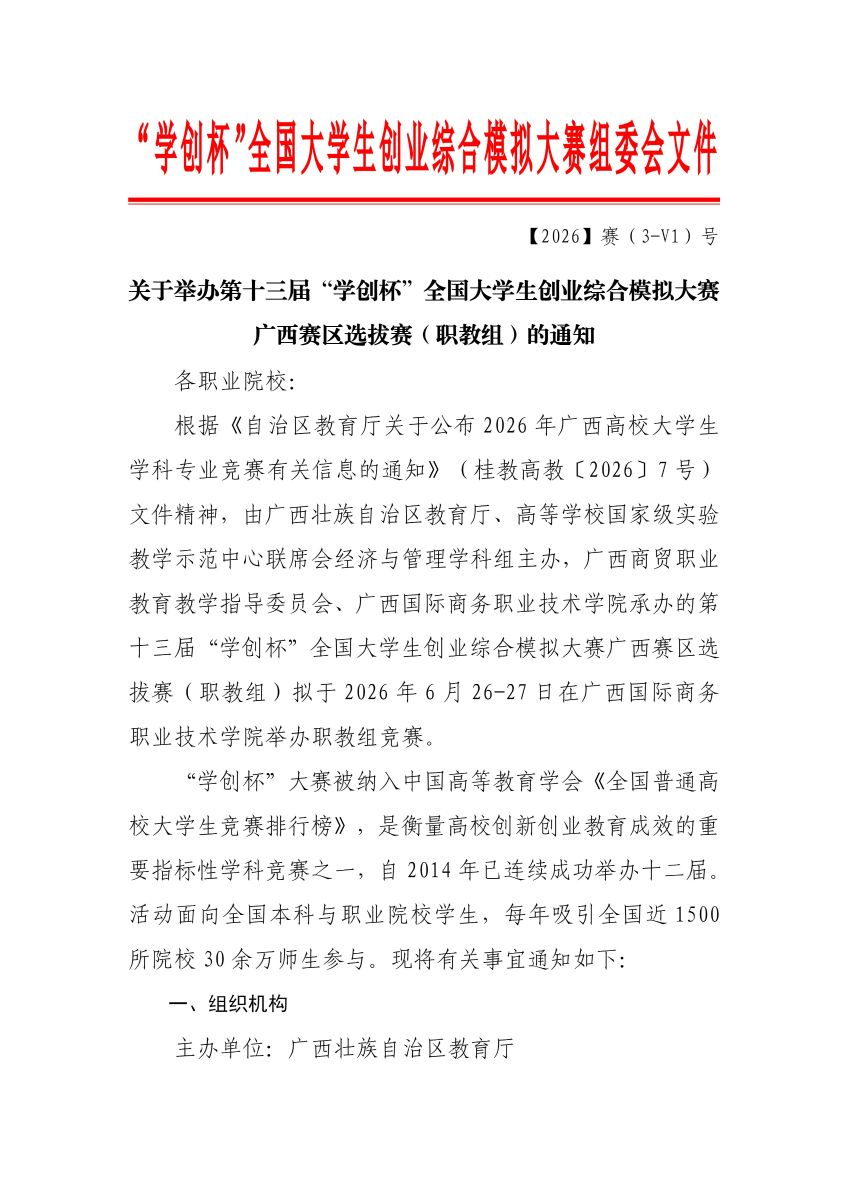 关于举办第十三届“学创杯”全国大学生创业综合模拟大赛广西赛区选拔赛(职教组)的通知