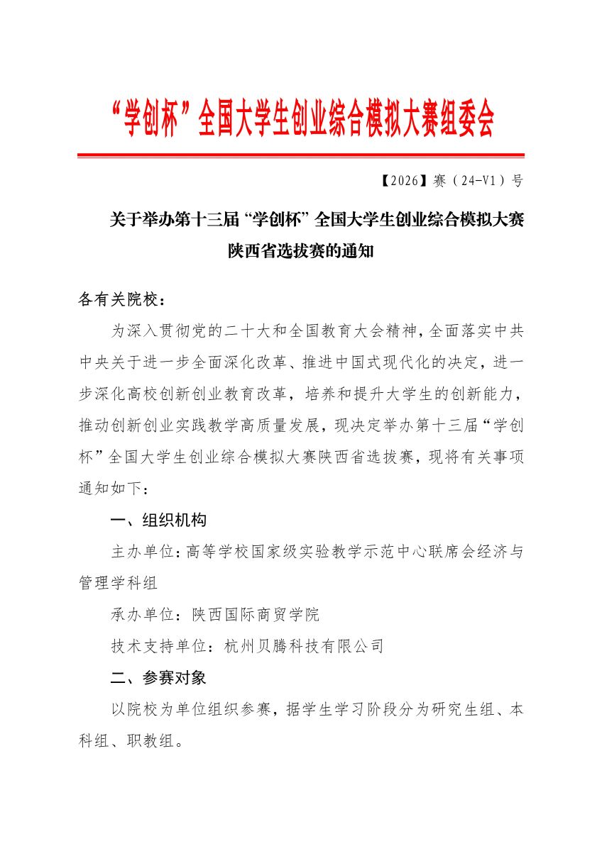 关于举办第十三届“学创杯”全国大学生创业综合模拟大赛陕西省选拔赛的通知