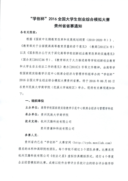 【通知】贵州省“学创杯”2016全国大学生创业综合模拟大赛省赛通知