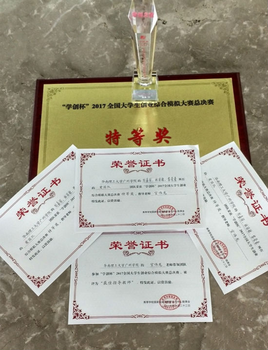 10月21日至22日,“学创杯”2017全国大学生创业综合模拟大赛总决赛在武汉举行,由黎荣豪、刘嘉丽和林丽敏三位同学组成管理学院沙盘协会队伍在总决赛中脱颖而出,获得总决赛最高奖项-特等奖的佳绩,团队指导官伟龙老师也获得赛事最佳指导老师称号。