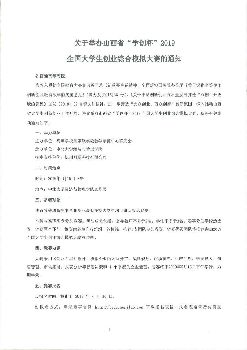 关于举办山西省“学创杯”2019全国大学生创业综合模拟大赛的通知
